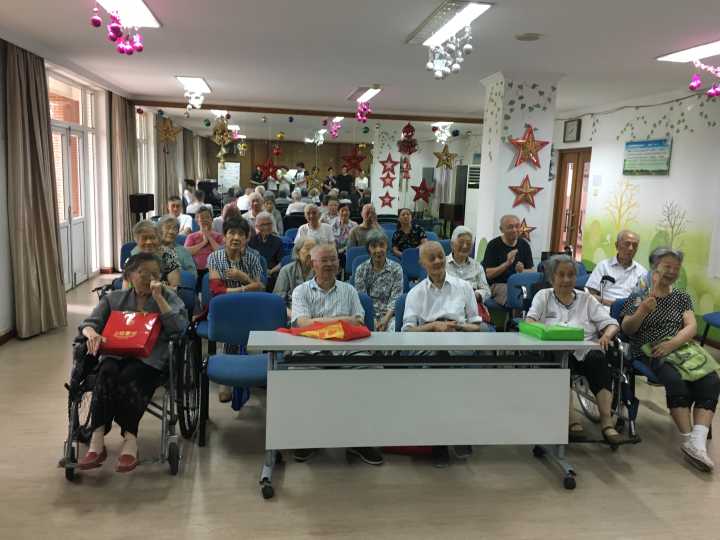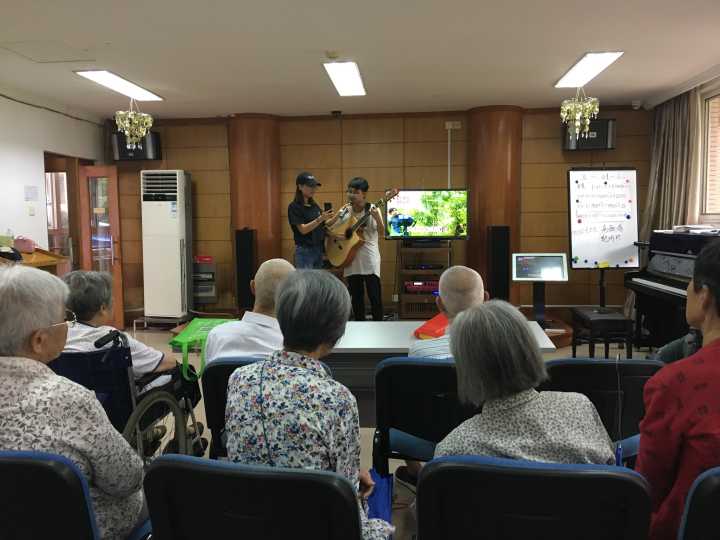 7月19日的早晨小组成员带着提前准备好的节目和材料前往无锡市社会福利中心。早上九点那里的老人像往常一样在大教室里进行他们日常的听歌唱歌的活动。他们到了那里正好老人门在进行活动,小组的同学准备了几个节目给老人表演,看到老人们开心的样子,他们觉得十分亲切。