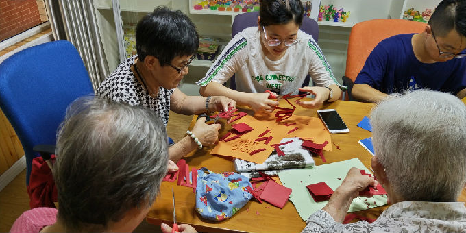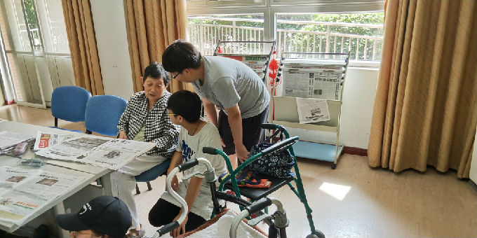 第二天下午两点三十分两个小组同时前往手工室和图书馆,小组成员提前就和老人们约好了,在他们午休后。剪纸小组提前就学习了许多窗花和折纸,奶奶们都很感兴趣,他们也很开心能够和老人们一起剪纸聊天。交谈中,同学们询问了他们的日常作息,并将健康的作息方式和饭前饭后注意的卫生知识和关切带给他们。第二组阅读小组在图书馆为老人们读报,并将提前准备好的医疗卫生知识的稿子都给老人们,这里的老人们还有许多大学教师教授,他们的知识都很渊博,他们也从老人们那里学到了很多知识。