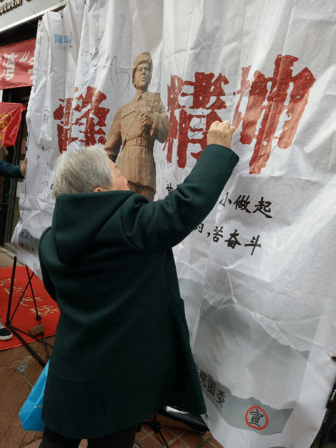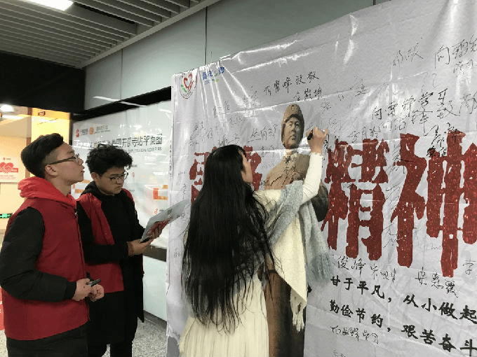 时间斗转,转眼来到了下午,一扫上午的阴郁,太阳也露出了它的笑容。志愿者们首先前往金河湾社区和梅园地铁站,在搭建好宣传布之后,向来往的人们介绍和宣传雷锋日。不管是叔叔阿姨还是爷爷奶奶,路过时总会驻足,也许他们因为赶时间并没有签名,但他们都对雷锋同志表达了最崇高的敬意。头发花白的爷爷奶奶都很积极的签名,边写边向我们诉说他们那个年代所认识的雷锋。