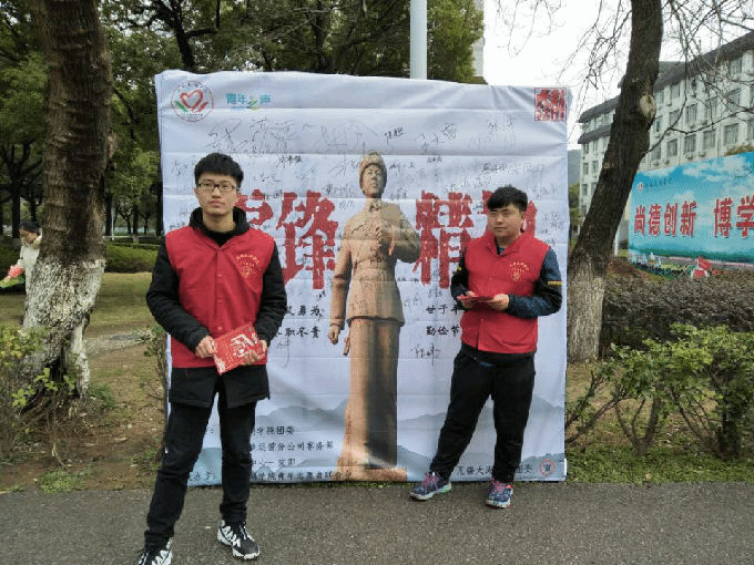 在清晨的第一缕阳光洒进校园的时候,志愿者们早已在南北区食堂门口守候,你会鲜明的看到发扬雷锋精神的宣传牌,志愿者们号召同学们在宣传布上签名,铭记这位英雄。