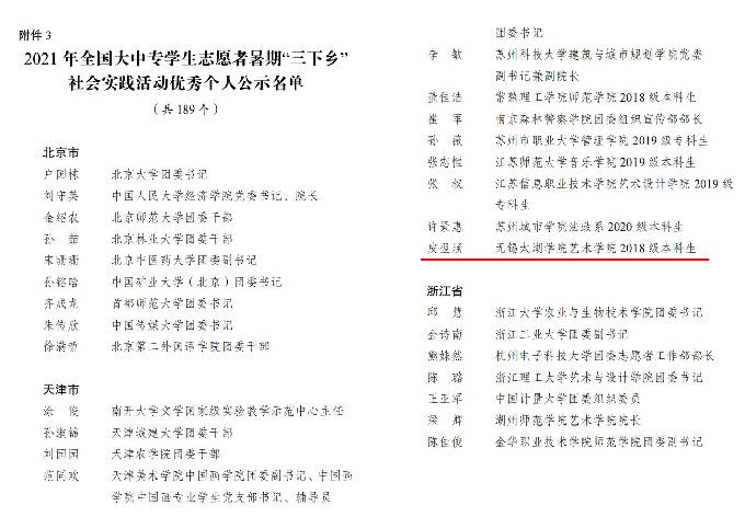 近年来,我校团委注重深化共青团实践教育工作。在疫情防控常态化形式下,深入推进社会实践的长效机制建设,着力提升实践育人成效。2021年暑期,我校组建了1800余支团队,覆盖在校生8123人次,深入农村乡镇、奔赴抗疫一线,开展丰富、有效的实践活动,获评2021年全国大中专学生志愿者暑期“三下乡”社会实践活动优秀个人;江苏省大中专学生志愿者暑期“三下乡”社会实践活动重点团队、先进个人;无锡市大中专学生志愿者暑期“三下乡”社会实践活动先进单位、优秀团队、先进工作者、先进个人等共计37项“三下乡”社会实践奖项。皮翌涵、潘木枝、郝利杰、百年荣光学习队、艺青春实践队等社会实践团队及个人活动多次受到人民日报、新华社、学习强国、《中国共青团》等媒体杂志报道,“太湖青年社会实践队”、“学党史、青年行”等10支团队被列为江苏省大学生志愿者暑期“三下乡”社会实践活动省级重点团队。