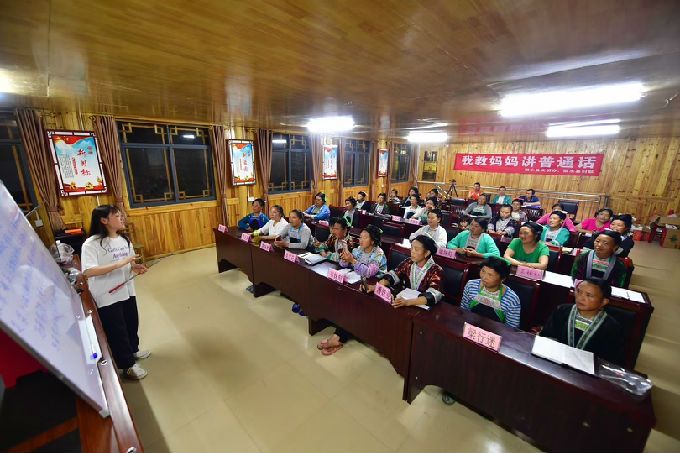八月上旬,来自商学院的潘木枝同学积极参与了由柳州市民宗委和融水苗族自治县妇联联合在桂黔乌英苗寨举办“我教妈妈讲普通话”培训班,并被聘为融水县“双语助脱贫”课外辅导员。在偏远的乌英苗寨,40岁以上的妇女几乎都没有上过学,语言障碍曾经是造成贫困的一个重要原因。为了帮助乌英苗寨实现可持续脱贫,潘木枝与团队其他成员在做好疫情防控的同时,以“扶贫先扶智,扶智先通语”为切入点,对部分留守妇女进行普通话培训,辅导当地妇女讲好普通话,为妇女儿童创造良好的学习环境,提高普通话重视程度和教育自信心,帮助他们更好地融入社会。