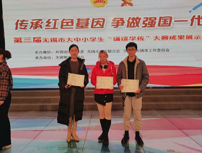 本网讯 近日,由团市委、市学联、市少工委联合主办的第三届无锡市大中小学生“诵读学传”主题诵读大赛圆满落下帷幕,来自全市14所高校的30组参赛队伍围绕传承红色基因、传承传统文化、坚定制度自信,弘扬中国精神等主题内容展开激烈角逐,由我校选送的诵读作品《请铭记,雾重庆》荣获特等奖,作品《活埋》、《雪域嘶鸣》均获一等奖。