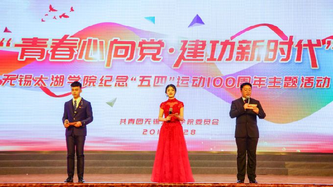 值“五四”运动100周年之际,由共青团无锡太湖学院委员会主办的无锡太湖学院纪念“五四”运动100周年“青春心向党,建功新时代”主题活动,于4月28日晚在工科实验实训中心报告厅正式启动。无锡团市委书记俞政业、团市委学少部部长吴燕、校党委副书记丁涛、办公室主任朱中伟、教务处副处长邹山花、校团委副书记陈朕、二级学院党总支副书记、二级学院分团委负责人及近千名团员青年代表齐聚一堂,穿越100年的时光长廊,追寻青春中的闪光回忆,赞颂代代相传的五四精神。