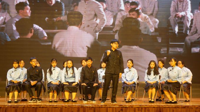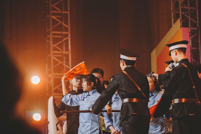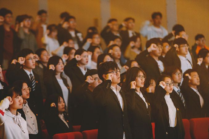 紧接着,由团员代表们参演的话剧《以青春的名义宣誓》生动地展现了五四运动的时代背景和学生爱国救亡的青年意志。剧中,五四运动学生代表在时代的洪流中坚定内心,爱国图存,举行了慷慨激昂的游行示威运动,震慑了帝国主义和无能的北洋政府。演员表现精湛,声如震雷,观众群情沸腾,掌声不息。话剧落幕,领誓人魏焕静同学来到舞台中央,面对国旗郑重举起右拳,带领大家庄严宣誓:“我是中国青年,我是祖国忠诚的儿女,五四火种在心,先辈夙愿在胸,复兴大任在肩。今天,面对国旗,我们庄严承诺:奋斗有我,让人民更加幸福!奋斗有我,让家园更加美好!奋斗有我,让祖国更加昌盛!百年传承,今日到我,激荡未来,壮志在我,青春万岁,强国有我!”铮铮的誓言代表着青年学生对祖国许下的庄严承诺,激励他们以青春之姿态昂扬向上,努力为中华民族伟大复兴的中国梦奉献智慧和力量。