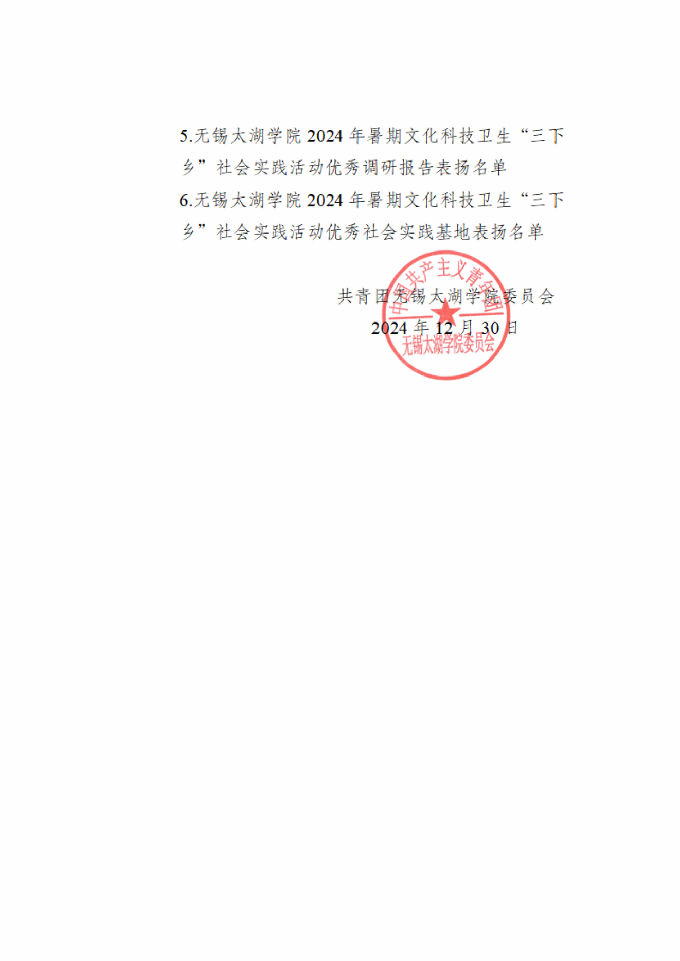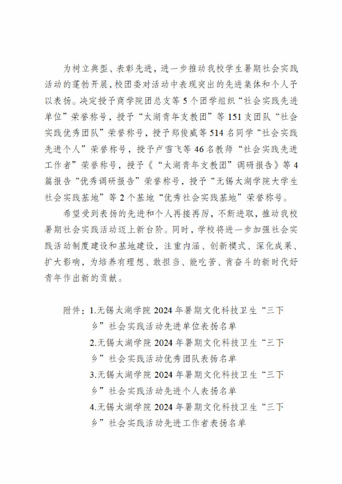 关于无锡太湖学院2024年学生志愿者暑期文化科技卫生“三下乡”社会实践活动的表扬决定