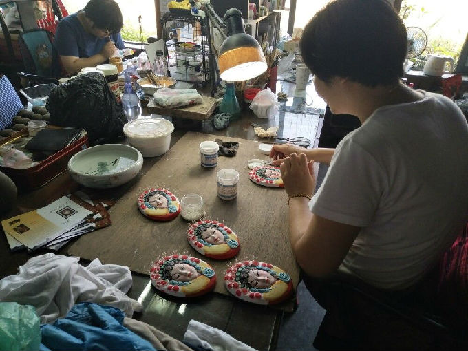 在与厂长的交谈中我们了解到惠山泥人虽作为国家非物质文化遗产,但是也面临着传统文化无人传承的窘境。惠山泥人的工匠师傅需要一定水平的美术功底与艺术水平,除了技术的要求也要求工人师傅们有毅力有耐心、肯吃苦。泥人的制作繁琐,花费时间长,为了保证泥人的质量工作室里没有空调,在炎热的夏天师傅们用的都是小型风扇来乘凉,所以厂长说每一位泥人师傅都是珍宝、独一无二的。