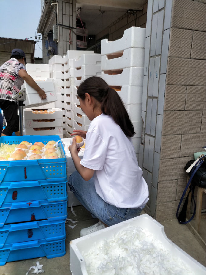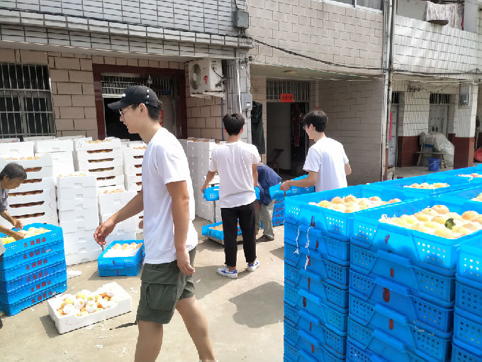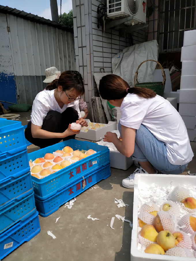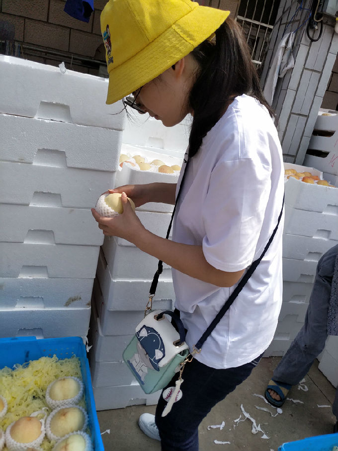 因为阳山水蜜桃的果大色美,香甜可口,所以有大量的客户订购。队员帮助挑拣,分装。村民告诉队员,要保证每一个装进盒子里的桃子都是完美的,有一点破损的地方都不可以装进盒子里打包,要做到对每一个客人负责,也是对自己品牌的负责。从他们认真负责的工作态度中,让实践队员也学到了很多。每一件事都要认真去做,是对别人负责,更是对自己负责。在劳作的过程中队员们也有幸尝到了著名的阳山水蜜桃,为我们的实践工作加入一丝甘甜。