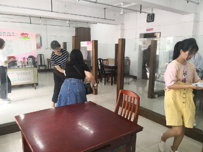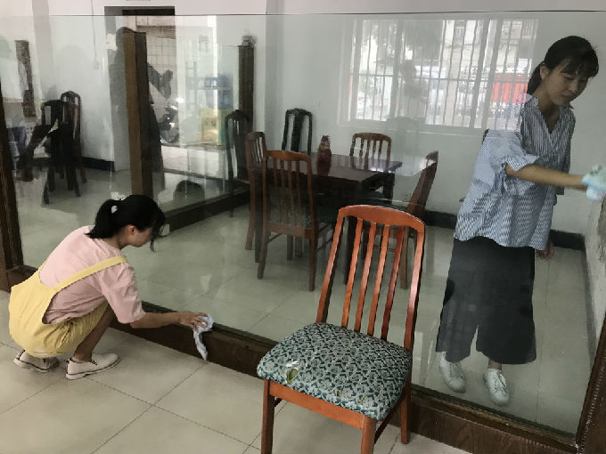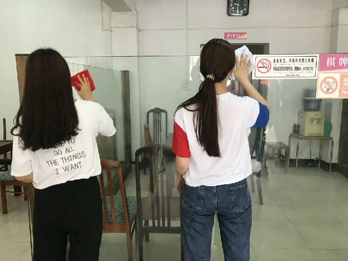 7月5日上午,拾志不渝”队所有成员按照约定时间准时到达龙山社区,龙山社区的负责人热情的接洽了我们并与我们盖了章,同时也带领着我们参观了实践基地,并分配任务给我们。在负责人的指挥下,组员之间分工明确,有序开展我们的志愿者活动。有的人负责擦窗户,有的人负责拖地,有的人负责擦桌子,一切都在有条不紊的进行着。我们所做的这一切不仅为前来活动的老人提供一个干净整洁的活动场所,也让我们深深体会到了满满的成就感,当看到爷爷奶奶脸上洋溢的笑容,活动室传来阵阵欢声笑语,负责人对我们的称赞,这些都是对我们最大的肯定。