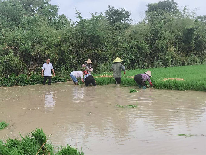 第二天早上“守望者”的小伙伴们定了早上五点半的闹铃,换上统一的着装,带着昨天和当地村民所借的下田专用的胶鞋,六点半大部队迈着坚定的步伐踏上了拔秧的旅途。首先带给我们阻力的便是泥泞的下田小道,“守望者”们在这时充分发挥了团队精神,互相搀扶着艰难地到达了拔秧地点。