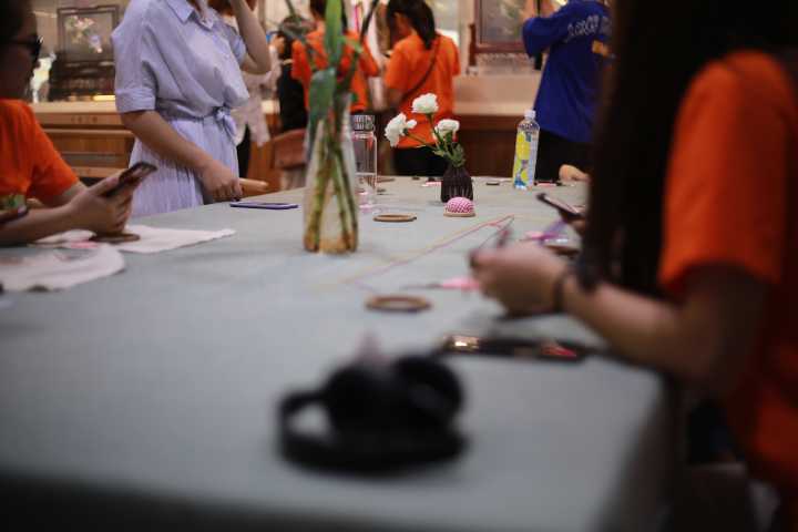 由于我们是初学者,老师为我们挑选了其中较为简单的香包、书签、手帕、胸针还有一些小的挂饰。老师为我们准备好了所需要用的材料工具,例如绣圈、银针、剪刀还有丝线。丝线是由我们选用的图案所挑选的,每根丝线上都有好几股线,在刺绣时只需从中抽取一根。