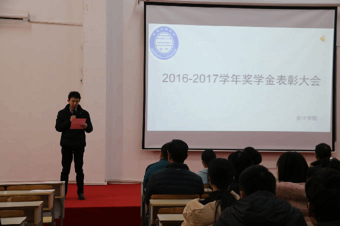 本网讯 12月26日上午九点半,会计学院2016-2017学年奖学金表彰大会在7号楼102隆重召开。会计学院院长唐建荣教授、副院长唐红珍教授、党总支副书记蒋昊霖老师出席了表彰大会。各系主任老师、辅导员和获奖学生等500余人参加大会,大会由会计学院学工秘书夏悦主持。
