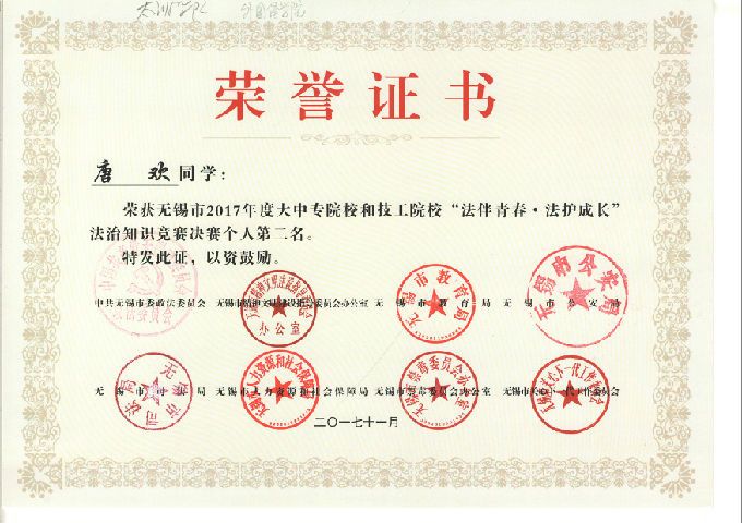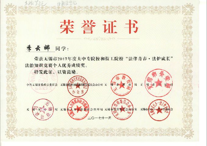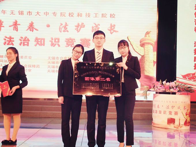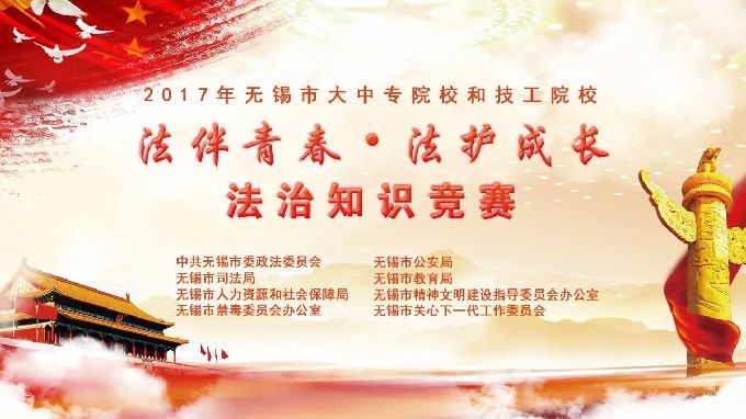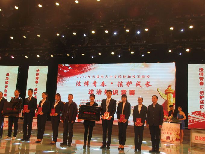 2017年12月1日,由市委政法委、公安局、司法局、教育局、人社局、文明办、禁毒办、关工委等八个单位,联合组织开展的全市大中专和技工院校学生法治知识竞赛决赛,在无锡市电视台拉开帷幕,来自全市7个代表队的21名学生,展开激烈角逐。