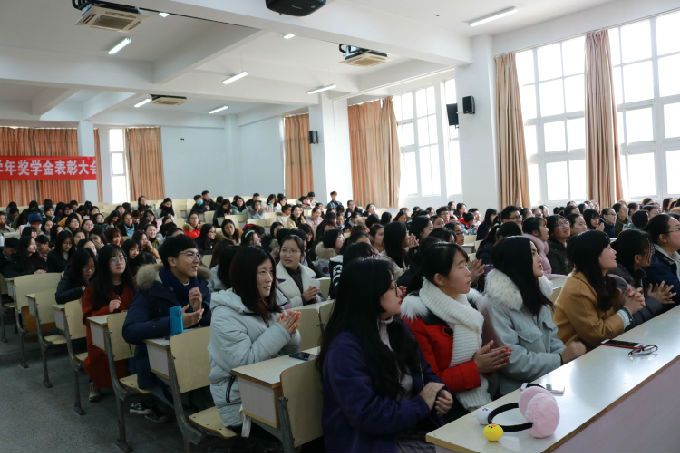 本网讯 2017年12月27日下午,外国语学院2016-2017学年奖学金表彰大会在7号教学楼102教室隆重举行。出席本次表彰大会的嘉宾有外国语学院院长包通法、外国语学院副院长刘荔、副院长吴旻昊和外国语学院党总支副书记郁群英,大会由学院学工秘书俞昊波老师主持。同时,我院三百余名奖学金获得者和大一的新生也参加本次表彰大会。