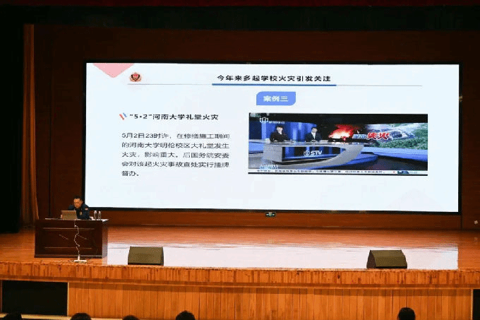 俞参谋结合近年来国内外发生的真实火灾案例,通过生动的图片和视频资料作为案例,向在会师生全面阐述了校园消防安全的重要性。并详细讲解了在日常学习生活中应注意的消防安全细节,如正确使用电器设备、避免乱丢烟蒂、保持疏散通道畅通等。同时,俞参谋还就如何扑救初期火灾进行了详细解说,其包括灭火器的种类、使用方法以及不同火灾类型的扑救策略等。