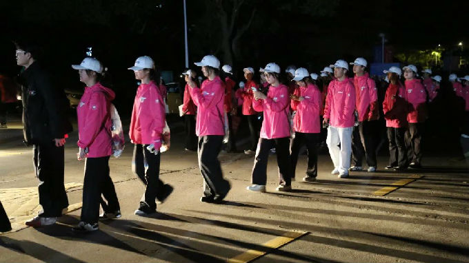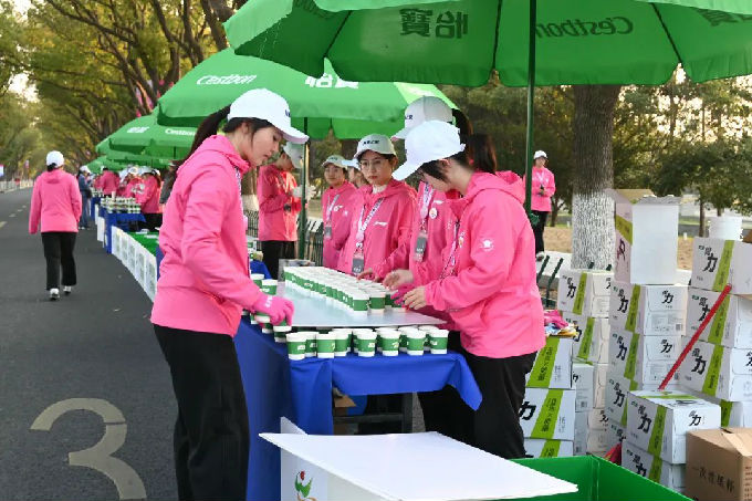 比赛日清晨4点,当城市还在沉睡,太湖学院的志愿者们已集结完毕。根据组委会安排,他们被分配至物资分发、赛道补给、秩序维护等岗位。虽然要凌晨起床,但想到能为赛事出一份力,大家都特别兴奋。在晨曦中,志愿者们迅速搭建起长达50米的补给长桌,精准摆放数千杯功能饮料,反复演练递水动作,确保赛事服务万无一失。