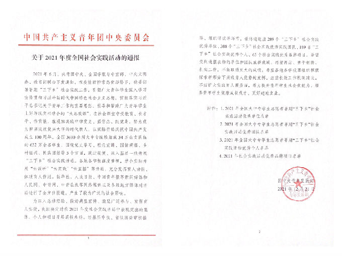 本网讯 近日,共青团中央对2021年暑期“三下乡”社会实践活动中表现突出的集体和个人进行了表彰。其中,我校皮翌涵同学荣获2021年全国“三下乡”社会实践活动优秀个人,这也是我校学生首次在“三下乡”社会实践活动中获得国家级个人荣誉。