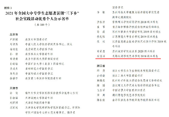 近年来,我校团委注重深化共青团实践教育工作。在疫情防控常态化形式下,深入推进社会实践的长效机制建设,着力提升实践育人成效。2021年暑期,我校组建了1800余支团队,覆盖在校生8123人次,深入农村乡镇、奔赴抗疫一线,开展丰富、有效的实践活动,获评2021年全国大中专学生志愿者暑期“三下乡”社会实践活动优秀个人;江苏省大中专学生志愿者暑期“三下乡”社会实践活动重点团队、先进个人;无锡市大中专学生志愿者暑期“三下乡”社会实践活动先进单位、优秀团队、先进工作者、先进个人等共计37项“三下乡”社会实践奖项。皮翌涵、潘木枝、郝利杰、百年荣光学习队、艺青春实践队等社会实践团队及个人活动多次受到人民日报、新华社、学习强国、《中国共青团》等媒体杂志报道,“太湖青年社会实践队”、“学党史、青年行”等10支团队被列为江苏省大学生志愿者暑期“三下乡”社会实践活动省级重点团队。