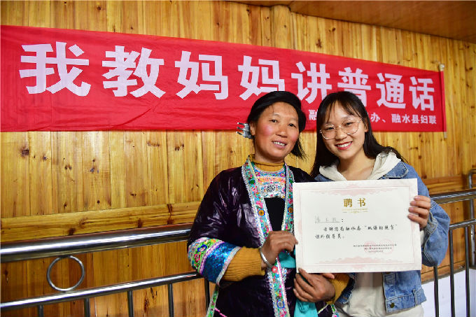 八月上旬,来自商学院的潘木枝同学积极参与了由柳州市民宗委和融水苗族自治县妇联联合在桂黔乌英苗寨举办“我教妈妈讲普通话”培训班,并被聘为融水县“双语助脱贫”课外辅导员。在偏远的乌英苗寨,40岁以上的妇女几乎都没有上过学,语言障碍曾经是造成贫困的一个重要原因。为了帮助乌英苗寨实现可持续脱贫,潘木枝与团队其他成员在做好疫情防控的同时,以“扶贫先扶智,扶智先通语”为切入点,对部分留守妇女进行普通话培训,辅导当地妇女讲好普通话,为妇女儿童创造良好的学习环境,提高普通话重视程度和教育自信心,帮助他们更好地融入社会。