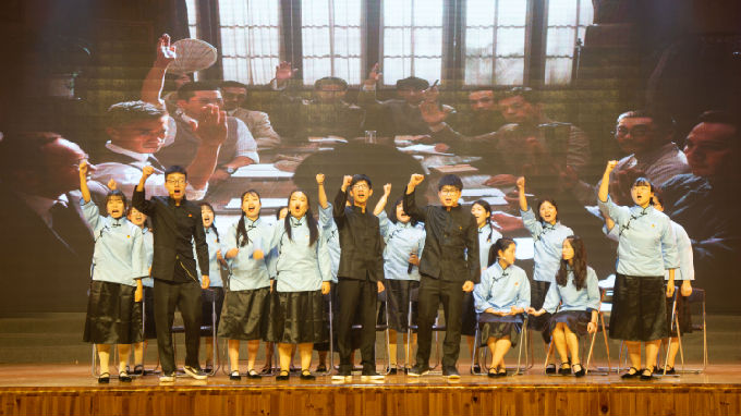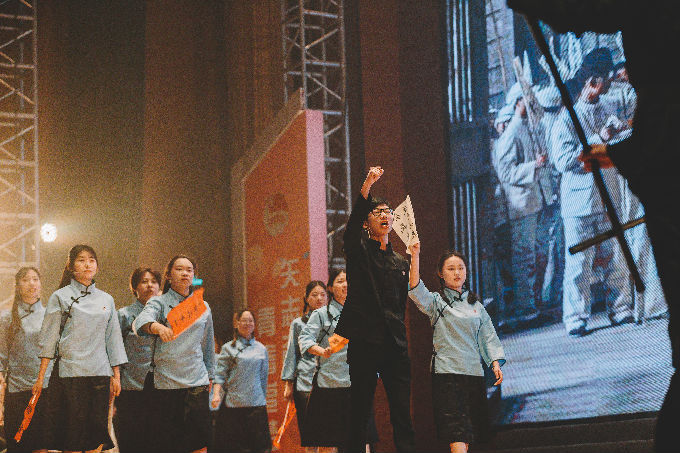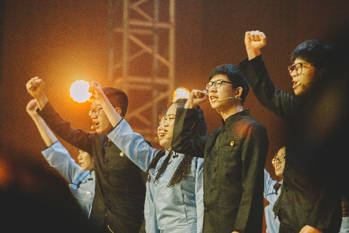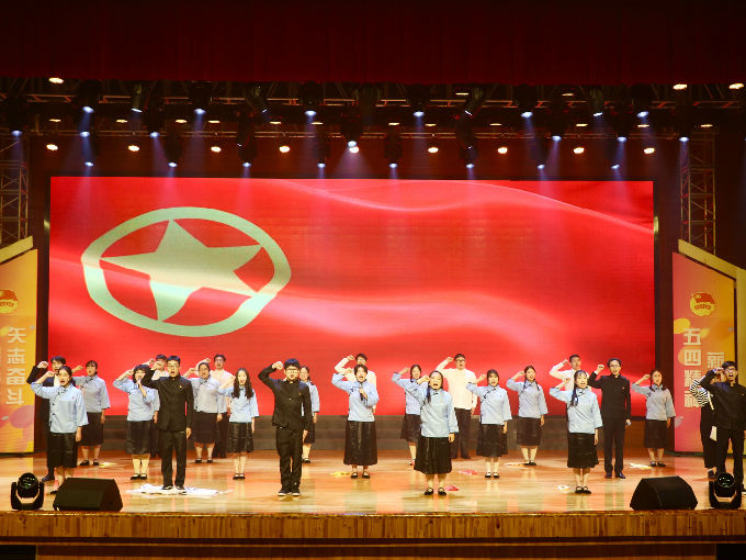 紧接着,由团员代表们参演的话剧《以青春的名义宣誓》生动地展现了五四运动的时代背景和学生爱国救亡的青年意志。剧中,五四运动学生代表在时代的洪流中坚定内心,爱国图存,举行了慷慨激昂的游行示威运动,震慑了帝国主义和无能的北洋政府。演员表现精湛,声如震雷,观众群情沸腾,掌声不息。话剧落幕,领誓人魏焕静同学来到舞台中央,面对国旗郑重举起右拳,带领大家庄严宣誓:“我是中国青年,我是祖国忠诚的儿女,五四火种在心,先辈夙愿在胸,复兴大任在肩。今天,面对国旗,我们庄严承诺:奋斗有我,让人民更加幸福!奋斗有我,让家园更加美好!奋斗有我,让祖国更加昌盛!百年传承,今日到我,激荡未来,壮志在我,青春万岁,强国有我!”铮铮的誓言代表着青年学生对祖国许下的庄严承诺,激励他们以青春之姿态昂扬向上,努力为中华民族伟大复兴的中国梦奉献智慧和力量。